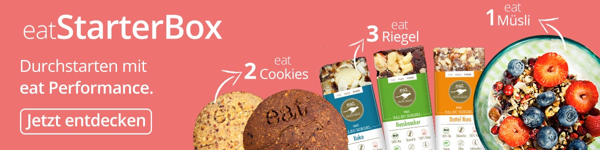 Kick-off in die gesunde und nachhaltige Ernährung: Du willst wissen ob die Paleo Welt was für dich ist? Unsere Starterbox mit den beliebtesten Produkten von „ eat Performance“ zeigt Dir ob es genau das Richtige für Dich ist! Hole Dir die leckersten Paleo - Snacks mit der eat Starterbox.