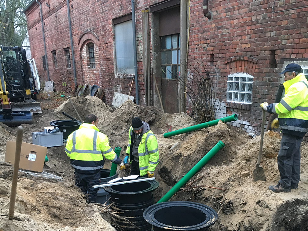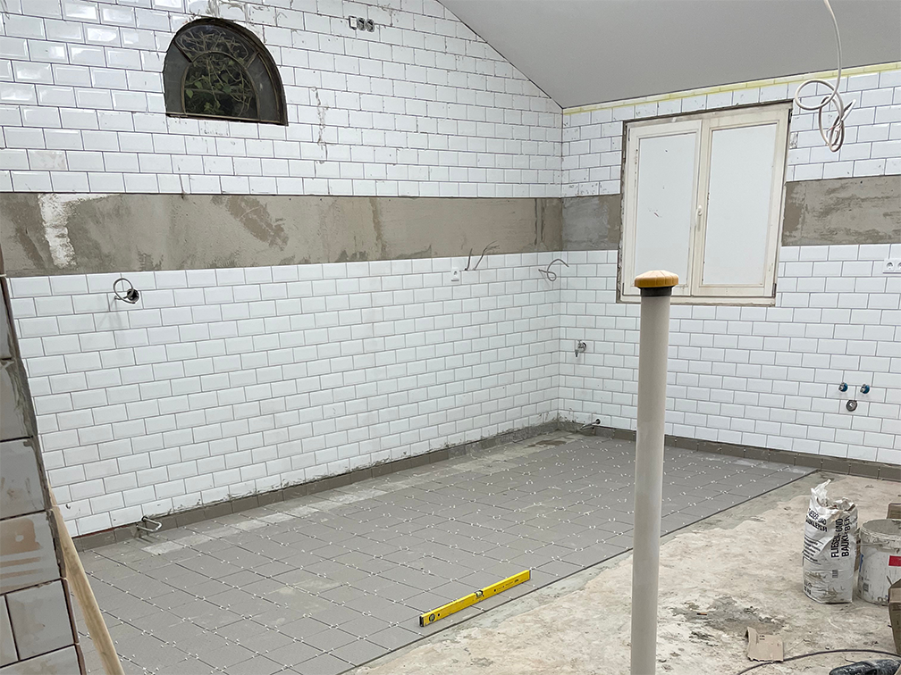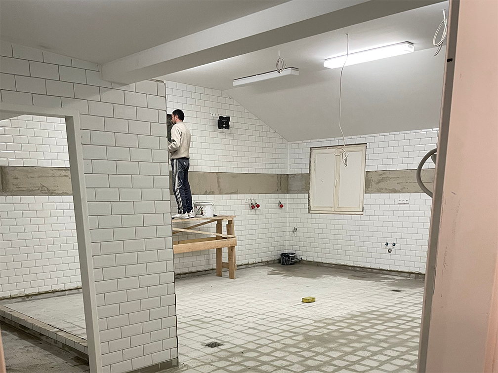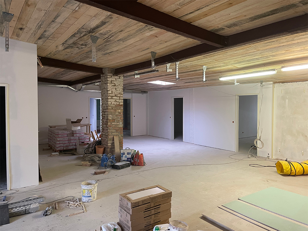 Viele Handwerker waren vor Ort tätig. Wasser- und Stromleitungen mussten verlegt werden, Wände gebaut, gefliest bzw. gemalert werden. In den Büros wurde der Teppich verlegt und dann ging es auch recht schnell und die Kisten und Euro-Paletten wurden gepackt.
