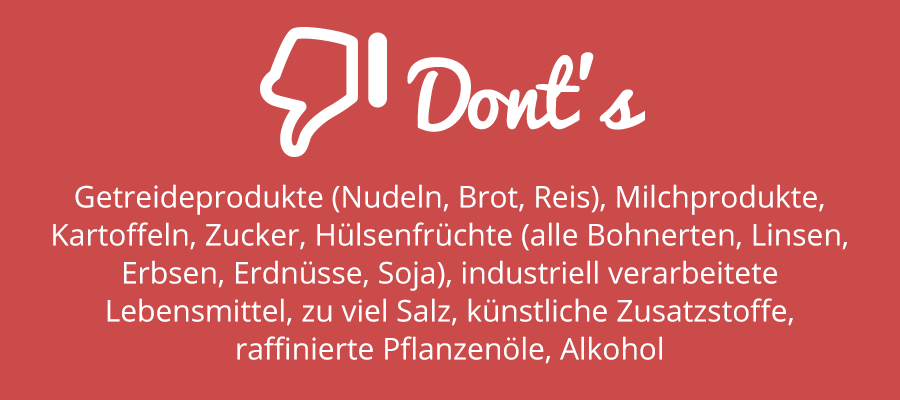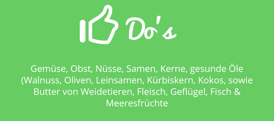 Eine Paleo-Ernährung sollte fett- und proteinreich und kohlenhydratarm sein. Deine Mahlzeiten sollten hauptsächlich aus Gemüse, Fisch, Fleisch Eiern oder anderen Proteinen, wie Samen oder Kernen bestehen. Kleine Mengen an Obst und Nüssen ergänzen Deine Mahlzeiten und sind der ideale Nachtisch. Die Hauptquelle für Flüssigkeit sind Wasser und natürliche Tees. Auf Alkohol und Getränke mit Zuckerzusatz sollte komplett verzichtet werden. Neben der klassischen Paleo Form existieren ebenso vegane Paleo-Modelle.