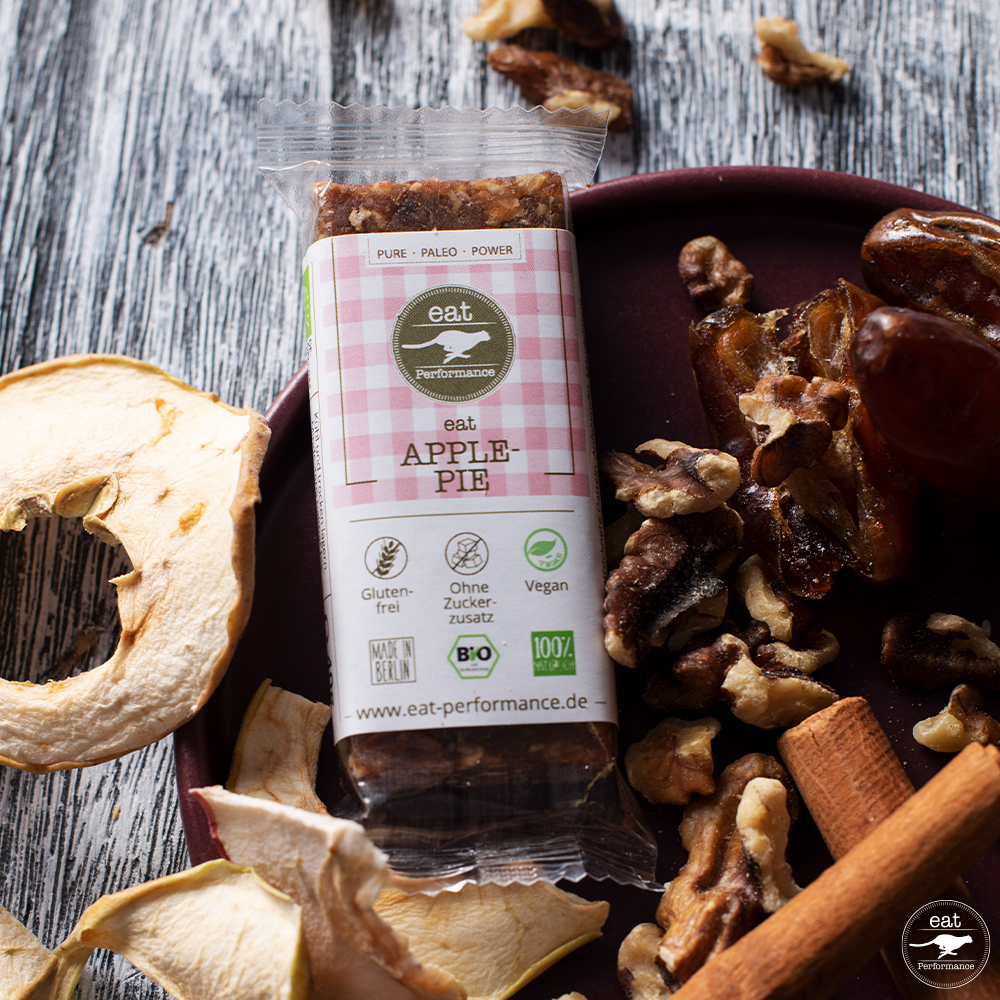 Der Apple Pie ist allerdings ein Riegel der erst viel später dazu kam. Damals kam Tobias, der zweite Gründer neben Wilhelm mit der Idee, dass es einen Riegel geben müsste, der so lecker ist, wie der Apfelkuchen, den er am Wochenende gegessen hat. Saftig, mit leckeren Äpfeln und Rosinen. Uns lief bei der Vorstellung das Wasser im Mund zusammen. Aber so etwas als Riegel muss erst mal funktionieren. Die eat Küche war gefragt und begann mit den Experimenten. Es wurde ein Weilchen herumexperimentiert, aber zu guter Letzt, klappte es. Und seitdem haben wir den leckeren Apfelkuchen für die Jackentasche.